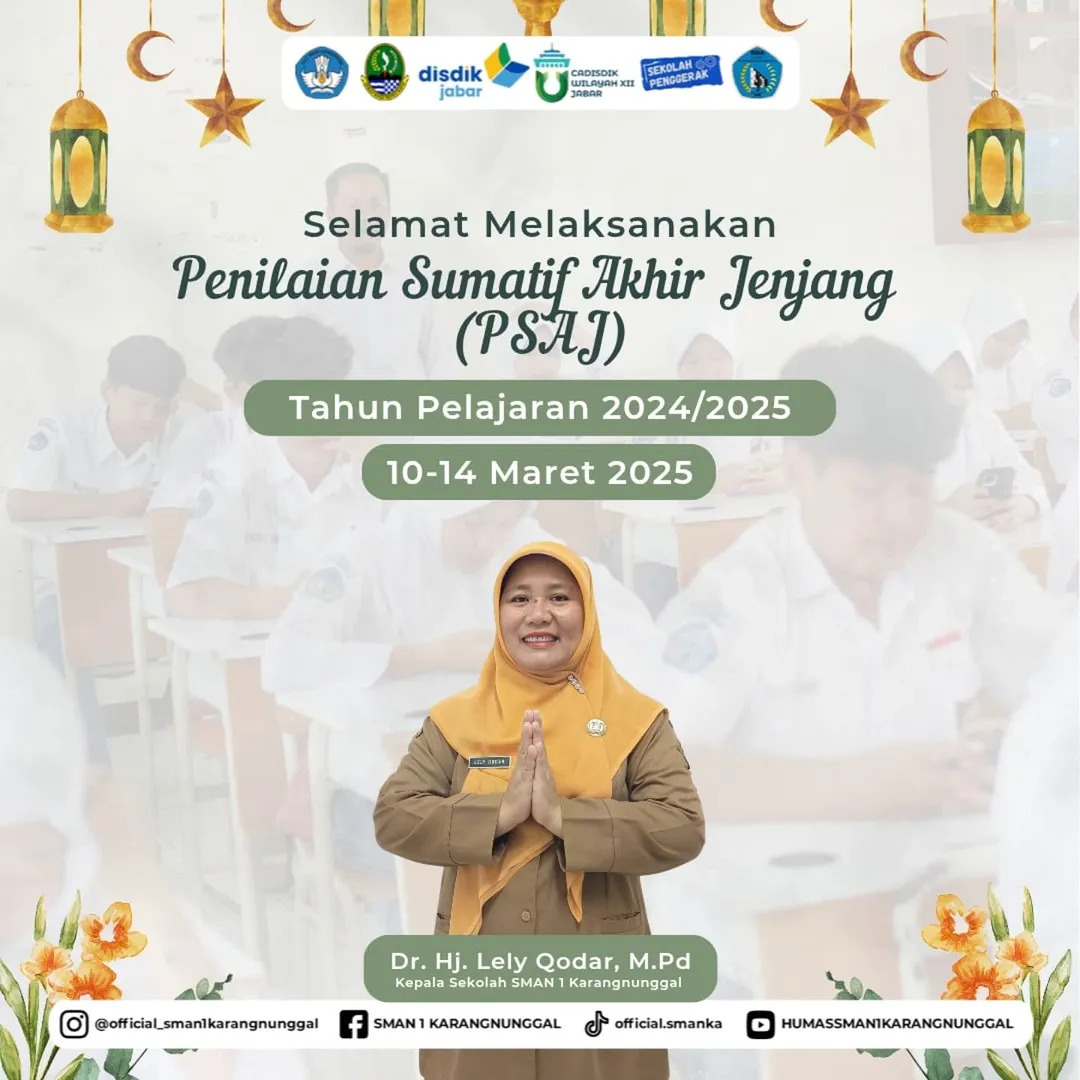 Hari ini tanggal 10 Maret 2025, peserta didik kelas XII melaksanakan Penilaian Sumatif Akhir Jenjang (PSAJ) di lingkungan SMAN 1 Karangnunggal.